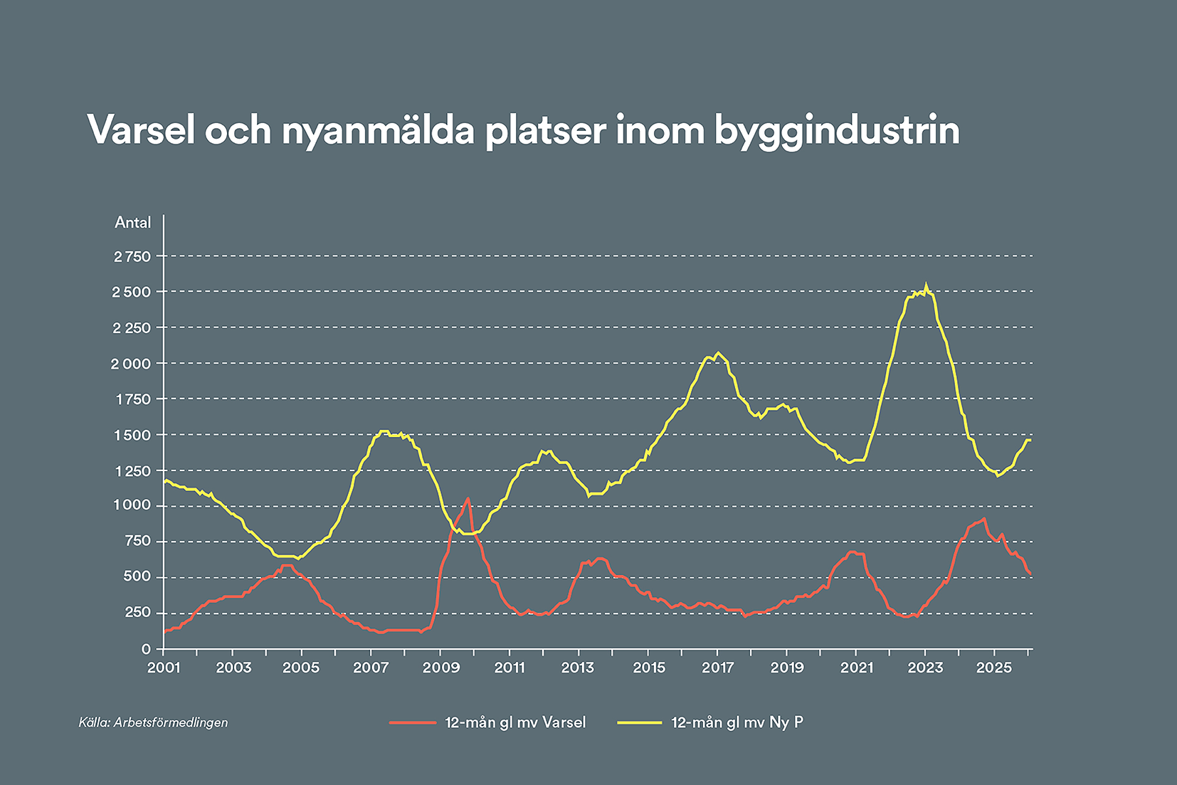 Vidare fortsatte antalet nyanmälda platser till Arbetsförmedlingen att öka med 26 procent i årstakt under fjärde kvartalet. Totalt nyanmäldes 4 243 platser inom byggsektorn under sista kvartalet i fjol.